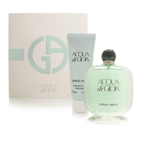 Acqua di gioia eau de parfum 100 ml + body locion 75 ml set regalo. Todo ello, presentado en travel set de Giorgio Armani.