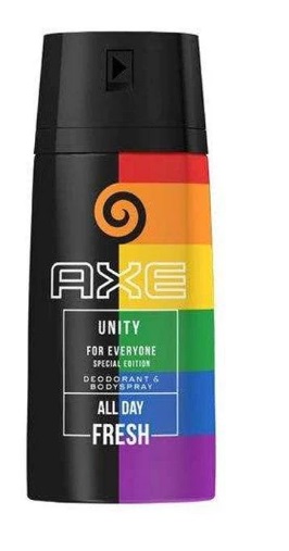 Axe Unity Desodorante que se  caracteriza por un llamativo envase que luce los colores de la bandera arco iris y cuyo lanzamiento en el mercado coincide con las fechas de celebración del Día del Orgullo Gay.