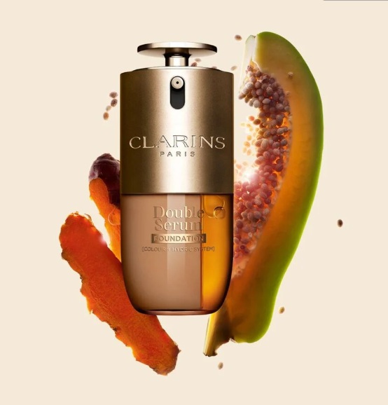 Clarins Base de Maquillaje Doble Serum Foundation una fusión revolucionaria de maquillaje y cuidado de la piel que aporta una luminosidad con un acabado satinado, luminoso y no graso.