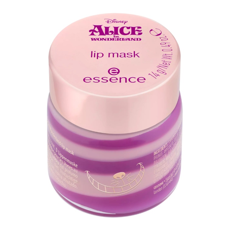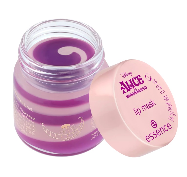 Essence Alice in Wonderland Mascarilla Labial presenta una divertida textura en espiral púrpura y rosada inspirada en el único e incomparable Gato de Cheshire.