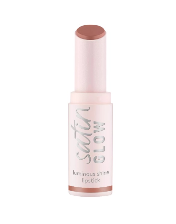 Essence Barra de labios Satinada Satin Glow combina color intenso, confort y un brillo satinado luminoso en un cálido tono nude.