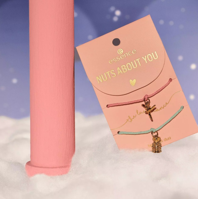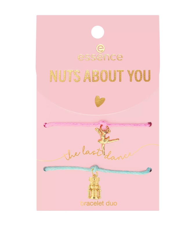 Essence dúo de pulseras nuts about you incluye dos pulseras de cordón ajustables en suave menta y rosa palo, cada una adornada con un delicado charm dorado metalizado de un cascanueces y una elegante bailarina a media bailarina.