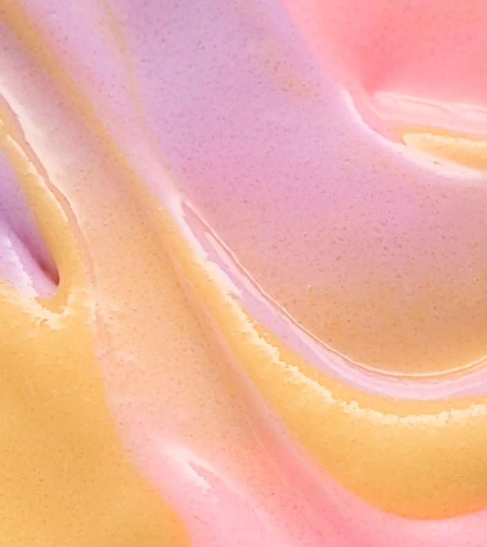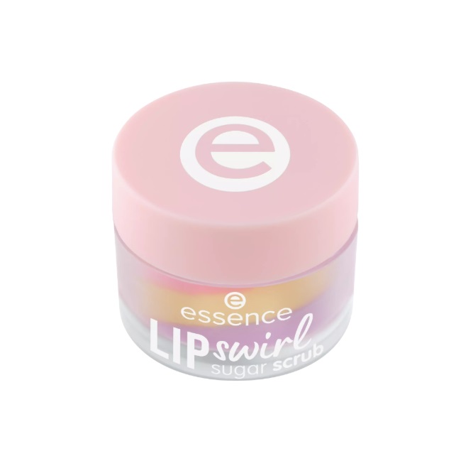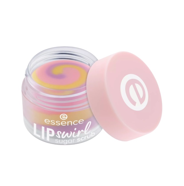 Essence Exfoliante labial Lip Swirl con aroma dulce y delicioso tiene una textura en espiral de tres colores (amarillo, coral y rosa) que se transforma en un bálsamo transparente al aplicarse.