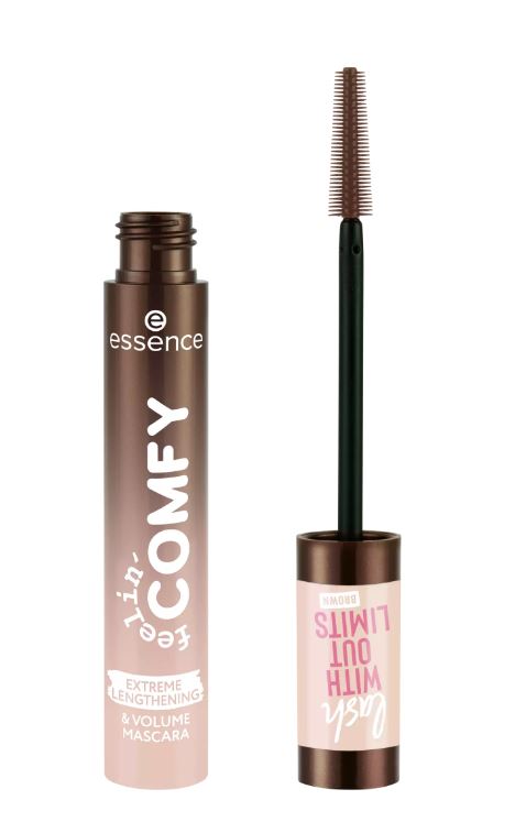 Máscara de pestañas essence feelin’ comfy en tono marrón crea pestañas bellamente alargadas con un acabado natural y voluminoso.