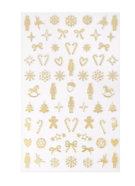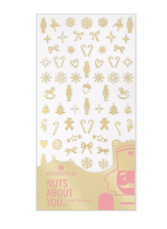 Essence Pegatinas para uñas nuts about you  incluye 66 encantadoras pegatinas con diseños dorados dulces, que incluyen de todo, desde copos de nieve y estrellas hasta bastones de caramelo, bailarinas y motivos de cascanueces.