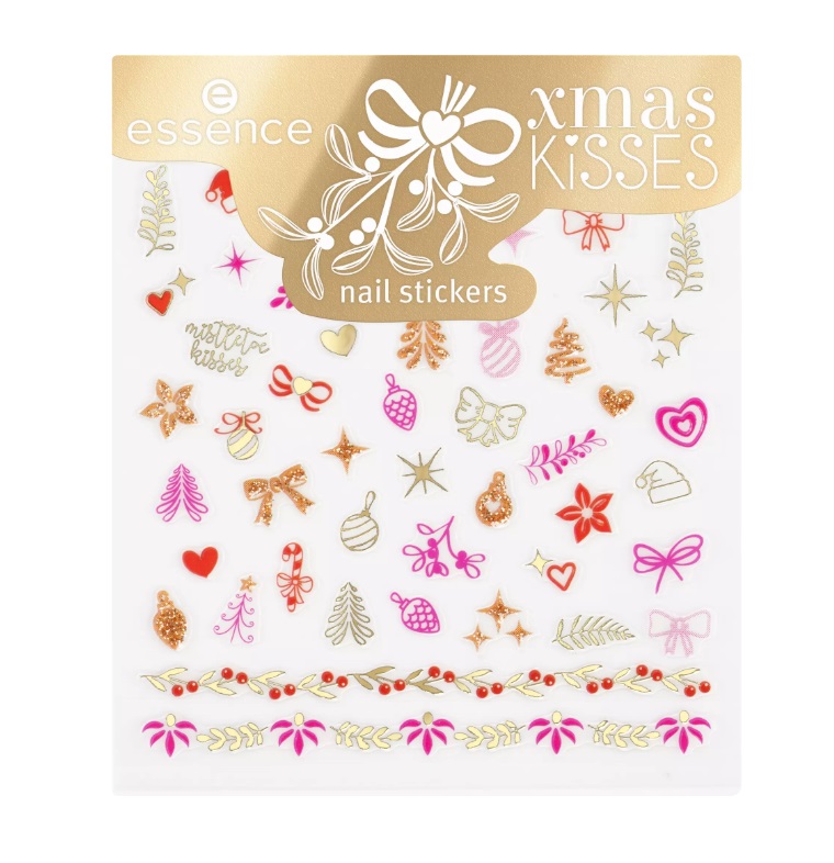 Essence Xmas Kisses Pegatinas para Uñas , el set incluye aproximadamente 60 pegatinas autoadhesivas para uñas con diseños navideños divertidos y coloridos, dorados y con glitter.