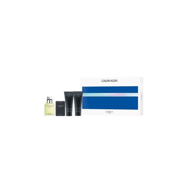 Eternity men eau de toilette 100 ml vapo + eau de toilette 20 ml vapo + after shave balm 100 ml + gel 100 ml. Todo ello, presentado en estuche-regalo de Calvin Klein.
