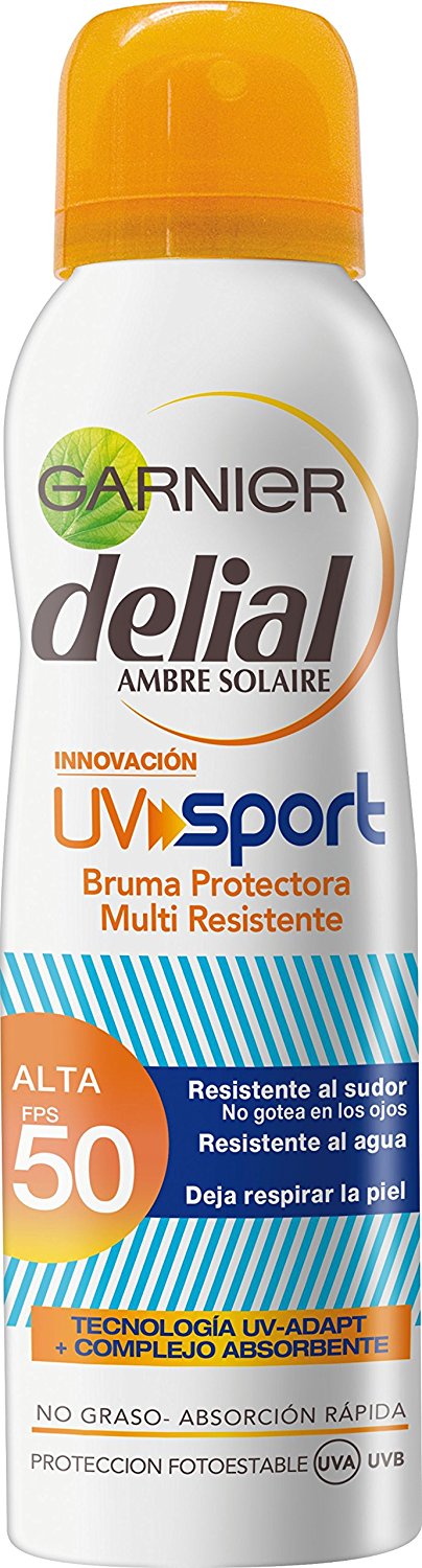 La bruma protectora FPS50 UV Sport de Delial ofrece protección solar para deportistas. Resistente al sudor y muy resistente al agua. La bruma protectora UV Sport Spray multi resistente, la primera alta protección solar de Garnier Delial testada bajo condiciones extremas, creada  pensando en los deportistas. Resiste al agua y el sudor para una protección óptima que se mantiene en la piel.