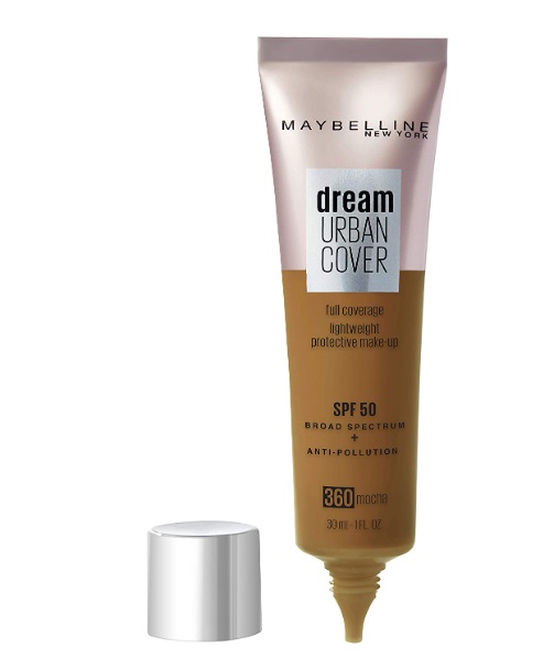 Maybelline Dream Urban Cover es una base de maquillaje con textura ligera que perfecciona, cubre manchas y protege hidratando la piel con un spf50.