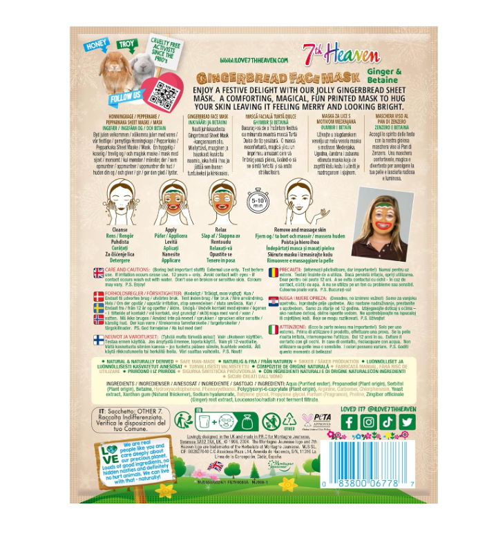 Montagne Jeunesse 7th Heaven Mascarilla De Tela Hidratante y Calmante Gingerbread contiene jengibre y betaína para hidratar, humectar y calmar tu piel.