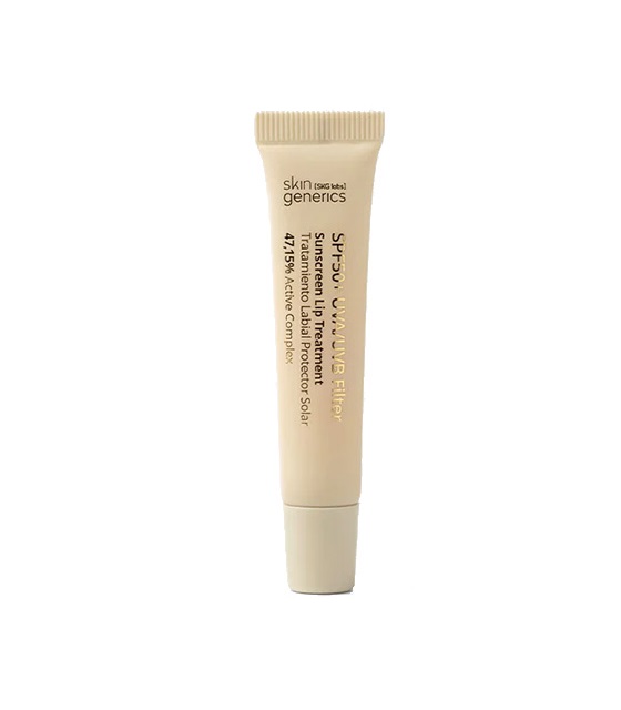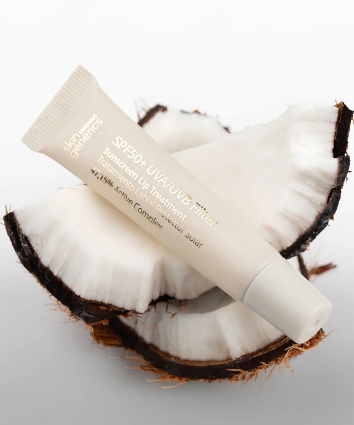Skin Generics Sunscreen Lip Treatment es un tratamiento para labios con SPF 50+ formulado para proteger los labios todos los días contra los rayos UV, la luz azul y la radiación infrarroja. Formulado con manteca de karité, aceite de ricino y ceras para mantener los labios protegidos e hidratados durante todo el año. Con una fórmula transparente con sabor a coco.